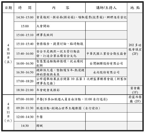 為促進熱浸鍍鋅產業之技術交流與會員聯誼,本會謹訂於115年4月10日至11日(星期五至六),假劍湖山渡假大飯店(雲林縣
